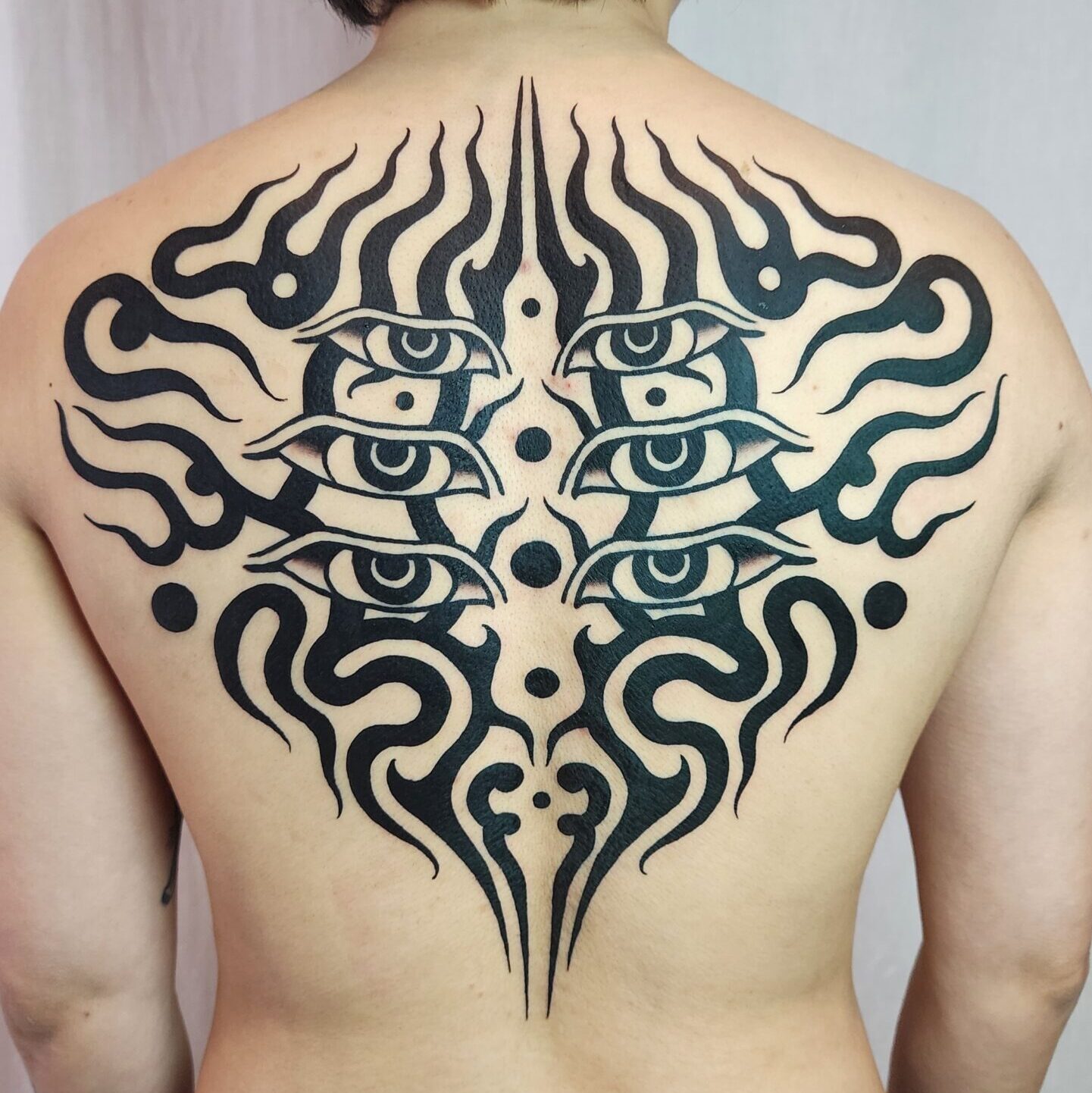 Asian art ornamentals that flows along your muscle anatomy that beautifies your body. Solid colour packing and dotworks in some design makes your tattoos unique and one of a kind.
