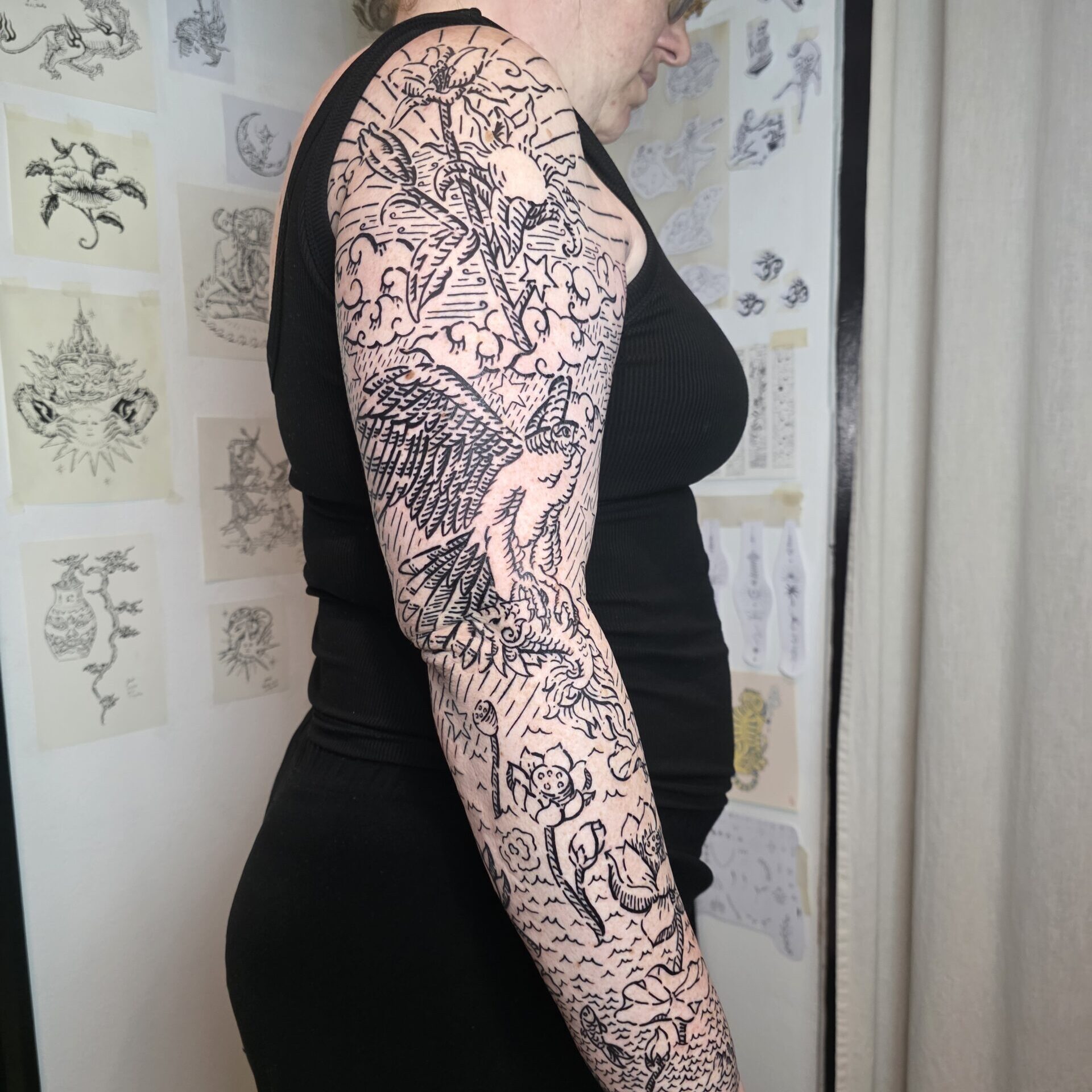 Jamie's style is turning any subject into etching/engraving style, turning imaginations into reality. At the moment, Jamie's personal designs and flash tattoos that are available are Thai mythology infused with classic Medieval style design.