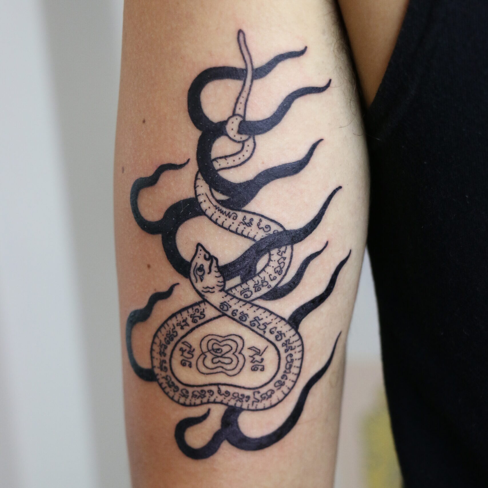 Jamie’s specialty is Thai style tattoos, inspired from Thai art. You can both customize your tattoo or choose from our flash tattoos collection.