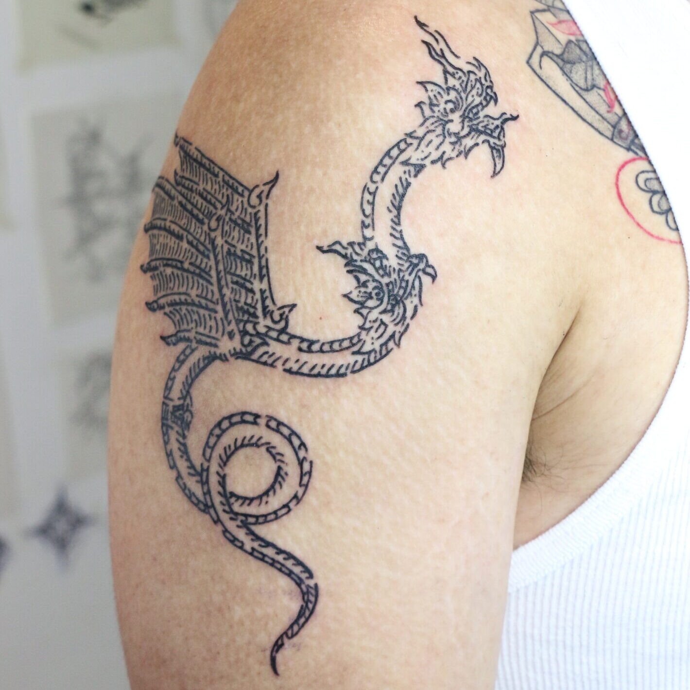 Thai Art infused with Medieval style etching technique for shadowing is one of a kind tattoos style. You can also turn your mythology and medieval inspiration into your own personalized etching tattoo.